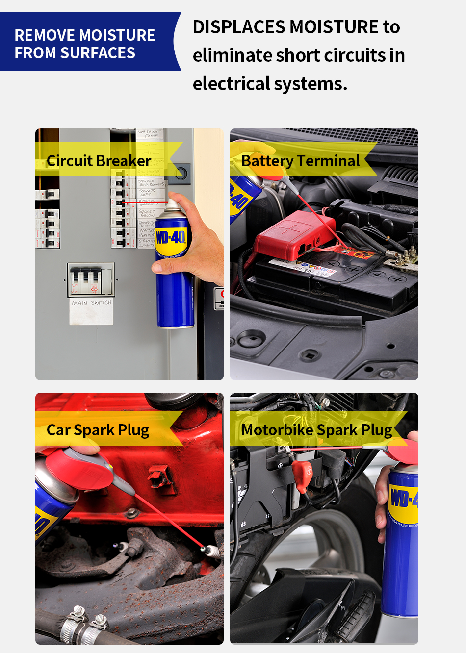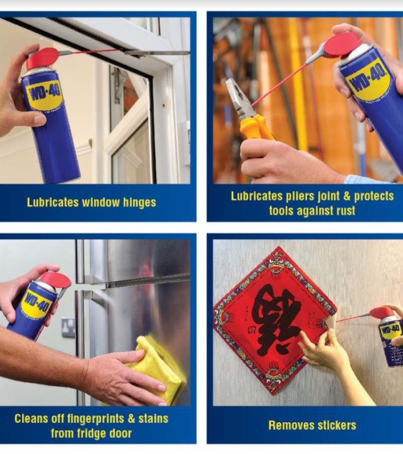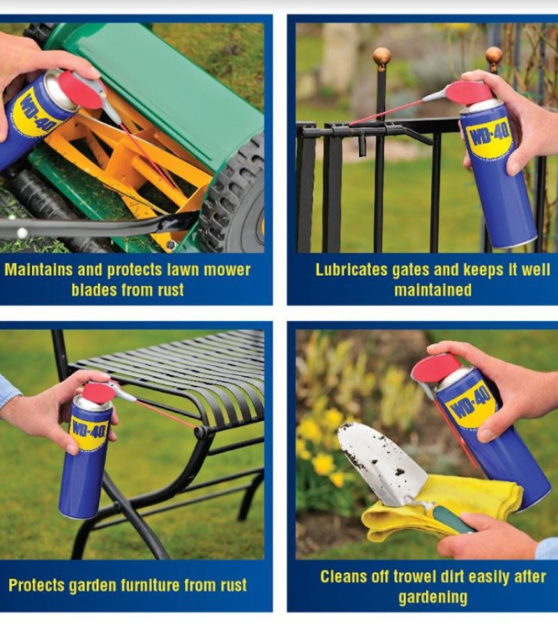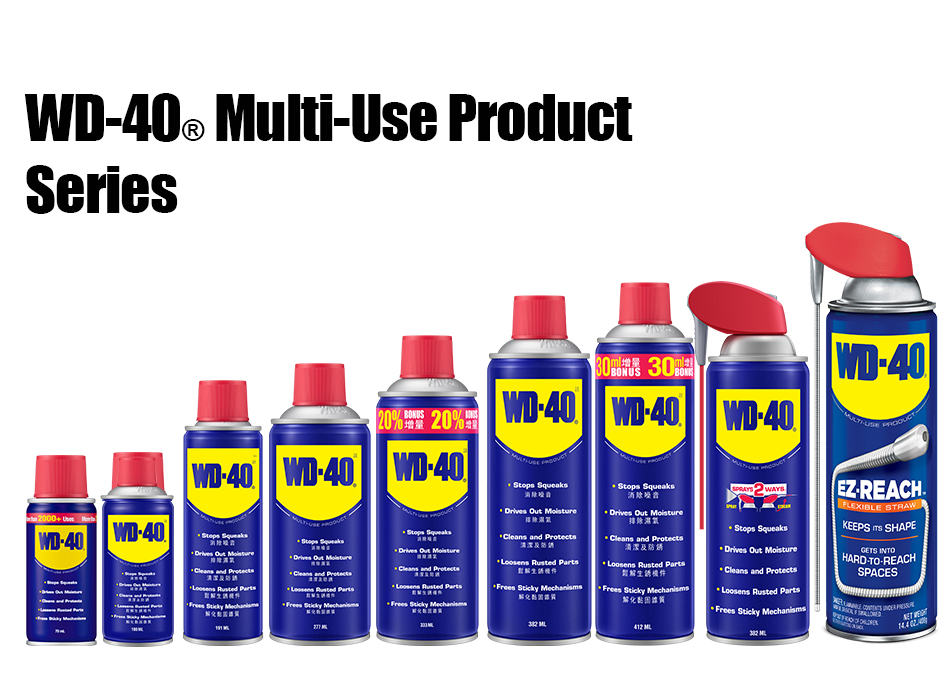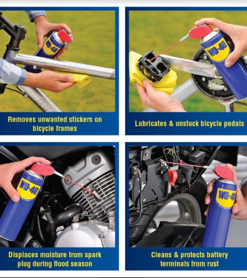 WD-40® Multi-Use Product lubricates moving parts such as hinges, wheels, rollers, chains and gears. It protects against rust and corrosion on items like tools and sporting equipment. It penetrates to free stuck corroded parts like nuts, bolts, valves and locks. It quickly removes adhesives, corrosion and paint. It displaces moisture to restore water flooded equipment such as engines, spark plugs and power tools.