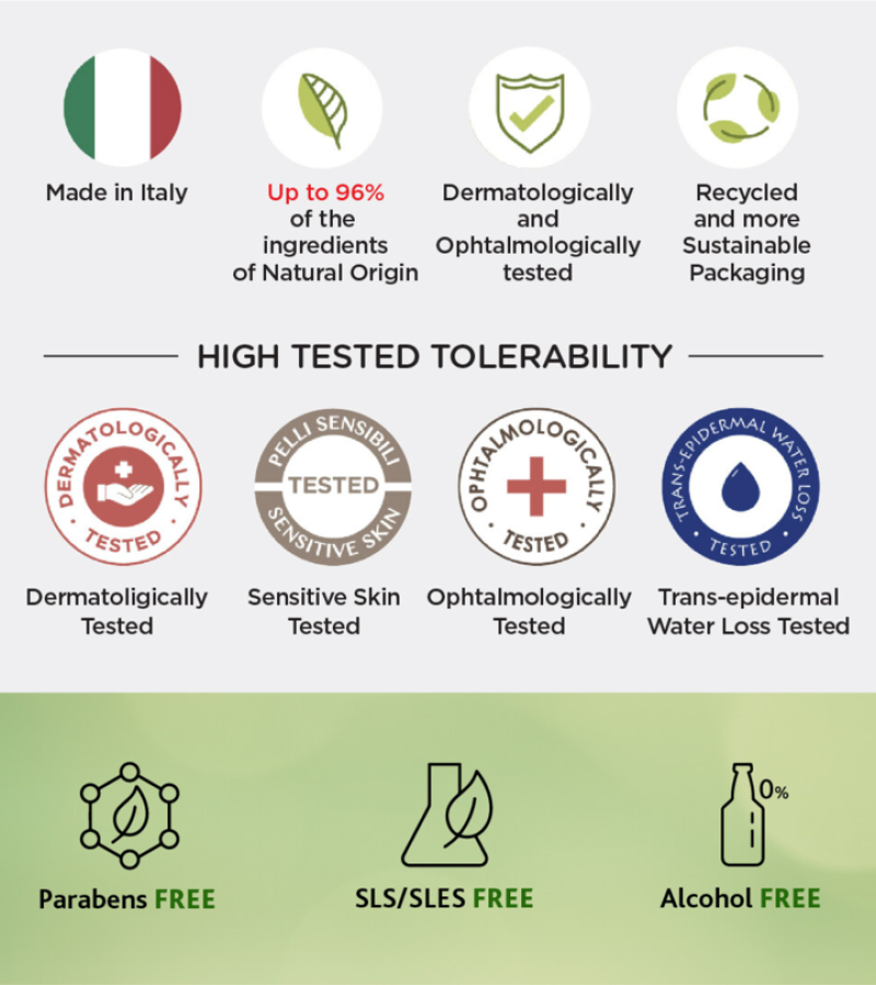 • All formulas: contains vegetal Glycerin and natural extracts has a delicate and unique scent are dermatologically and ophtalmologically tested