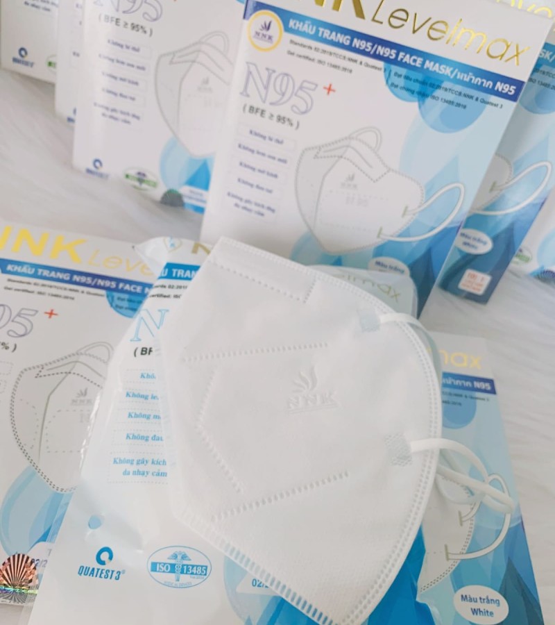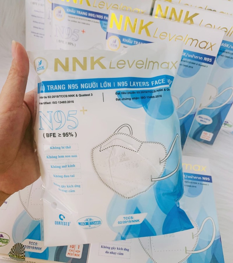 NNK N95+ LEVELMAX ISO Premium Medical Mask.ISO Certified.ISO 9001 : 2015.ISO 13485 : 2016.Standard VN 8389 - 1 : 2010.CE Certified.BFE>95%Quatest 310 embossed mask per box.Expiry Date: 2026 onwards.