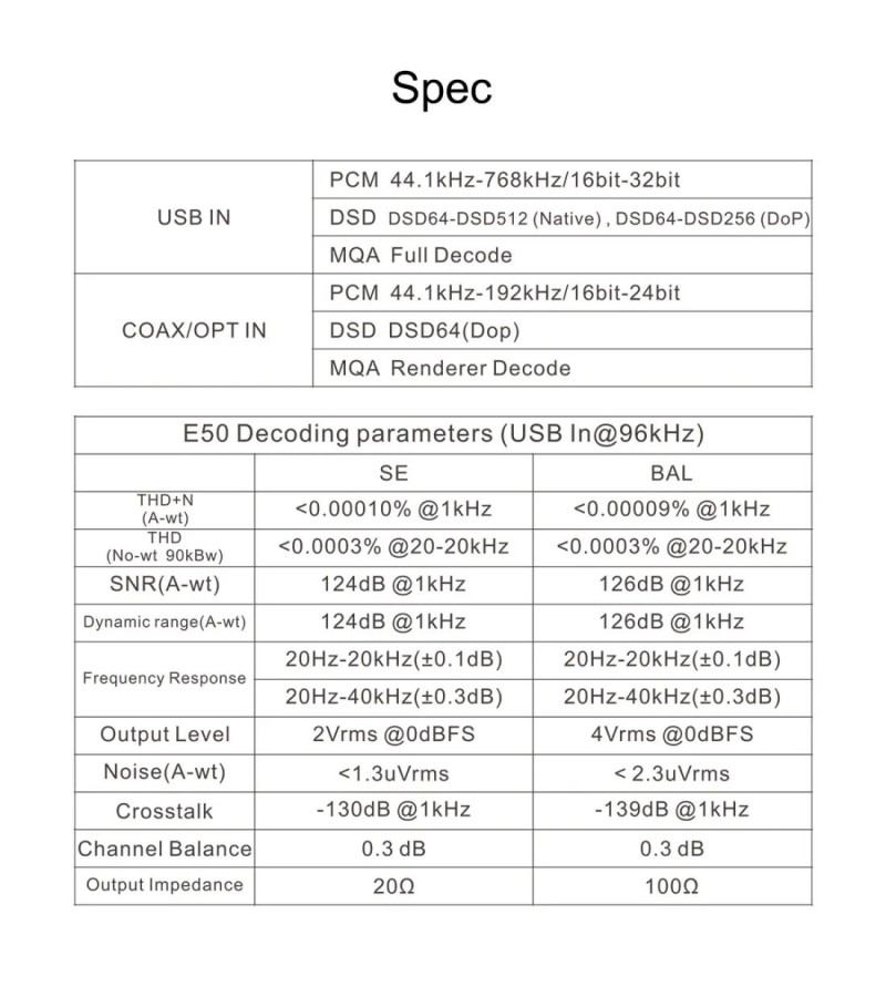 With the help of careful design and adjustment, E50 provides a distortion as low as 0.00009% and a dynamic range of 126dB, providing you with perfect sound quality.