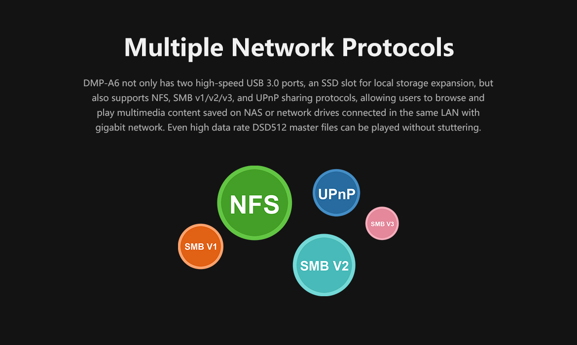 > Support NFS, SMB, Web DAV, UPnP protocols to access storage devices shared in the LAN.