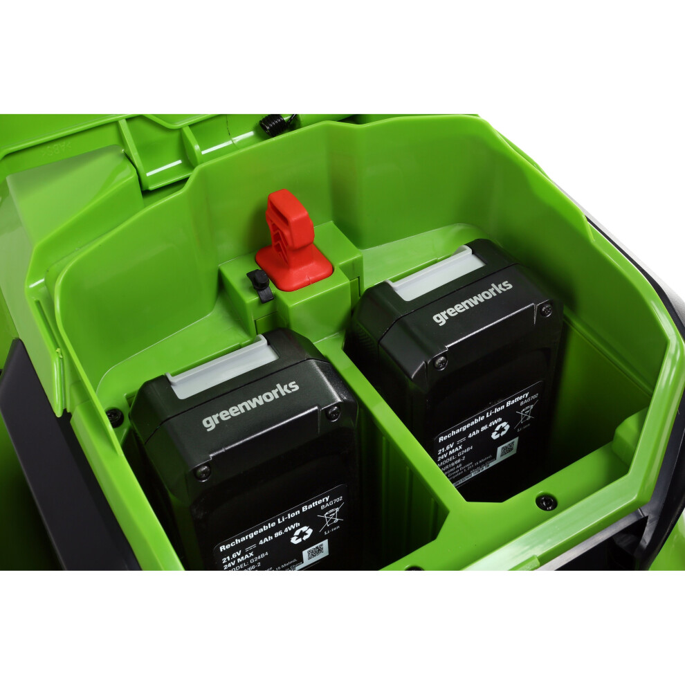 - 2 x NEW GENERATION LITHIUM 24V 4Ah BATTERIES AND BRUSHLESS MOTOR – engineered for reliability, lower maintenance and longer lifespan, powered by advanced batteries that you can use in any Greenworks 24V tool to cut waste, save money and storage space